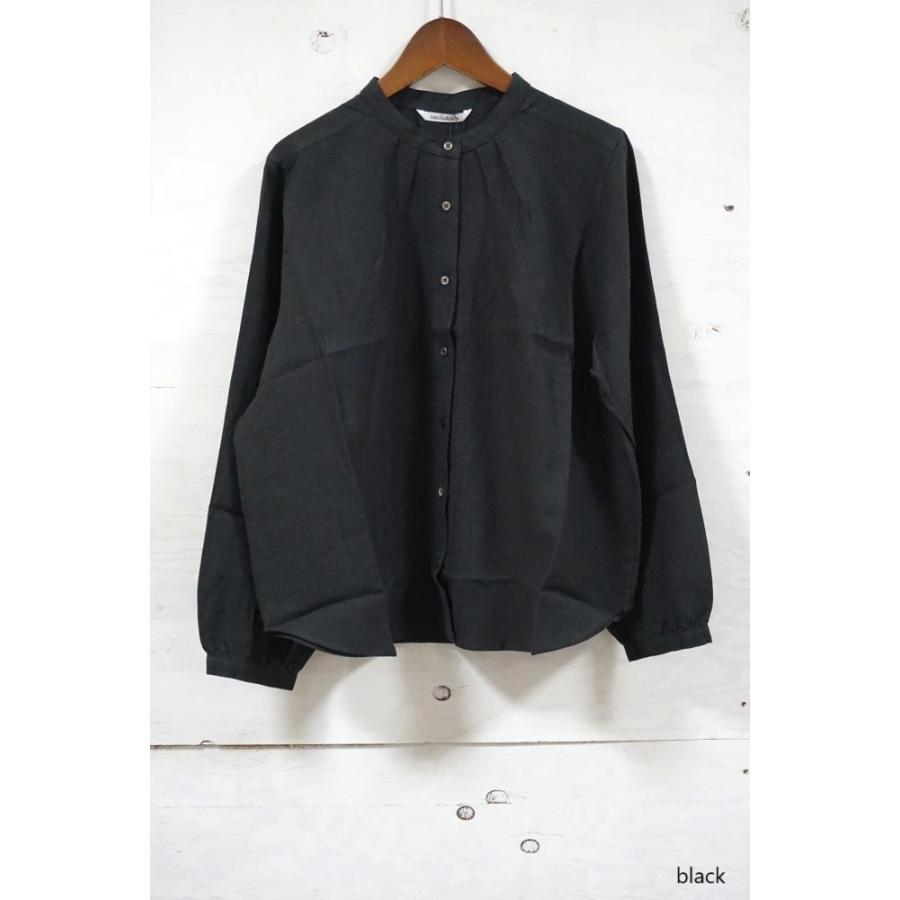 衿ぐりに入れたタックがポイントのバンドカラー長袖ブラウス。