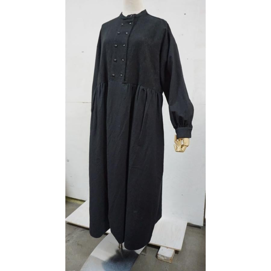 エレガントとシックを兼ね備えたワンピース。フロントのダブル釦は右側の3個目からフェイクボタンで