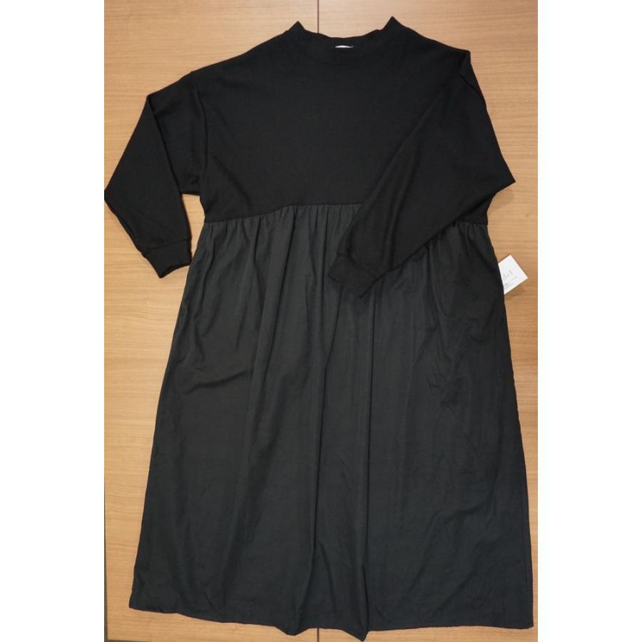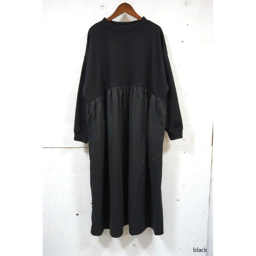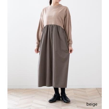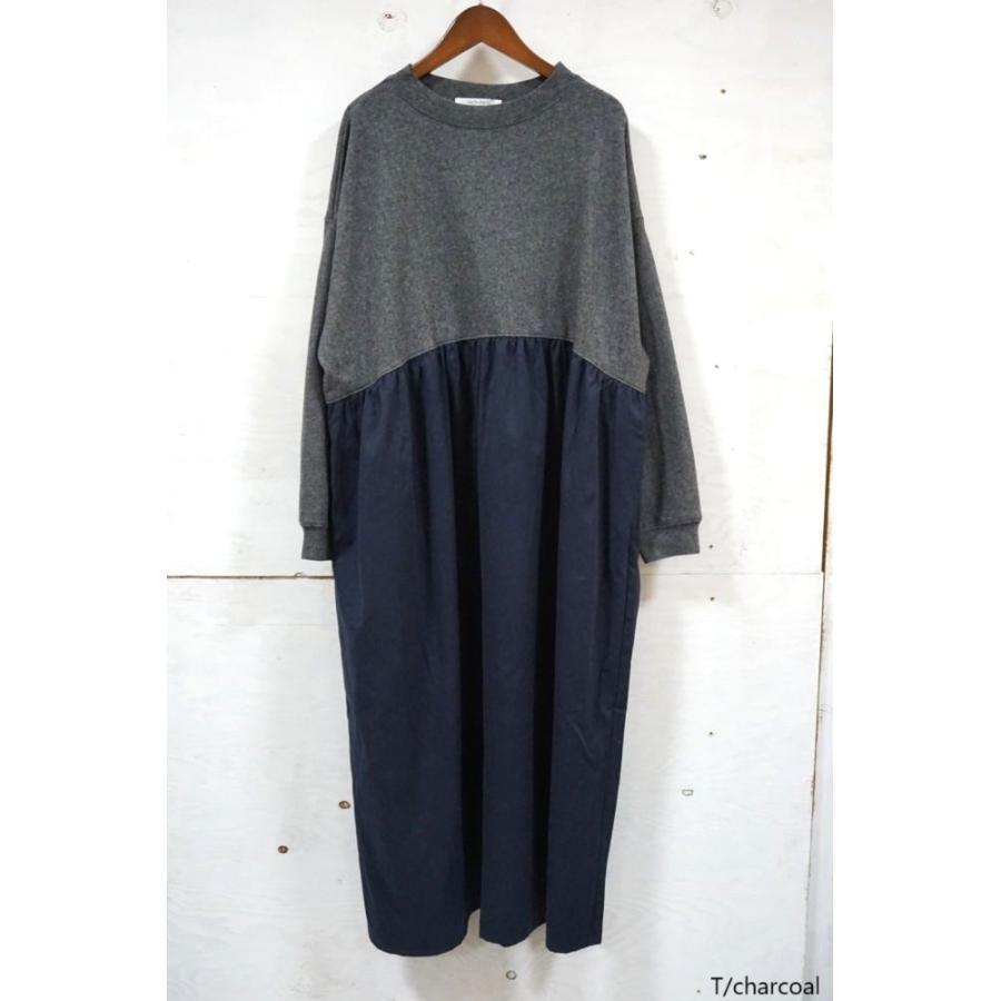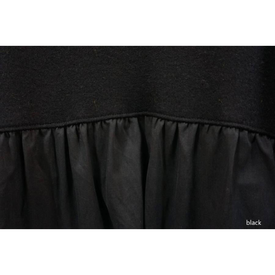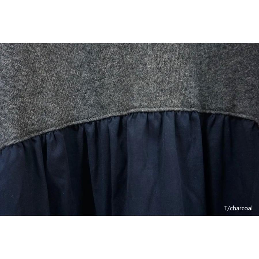 ウエスト切替から下は微起毛加工を施した布帛生地使用。ウエスト下に細かいギャザーを寄せたフレアーシルエット。
